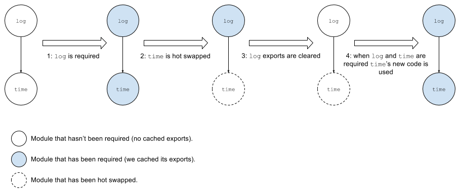 For log to pick up time changes, we'll need to clear its cached exports because one of the modules it depends on was hot swapped (step 3). Finally, when log gets required again, its factory function will get executed requiring time and getting its new code.